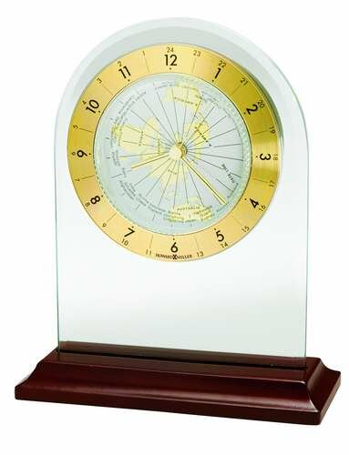 The World Time Arch Table Clock by Howard Miller is a world-time table alarm clock with beveled-glass arch set in a satin rosewood base.