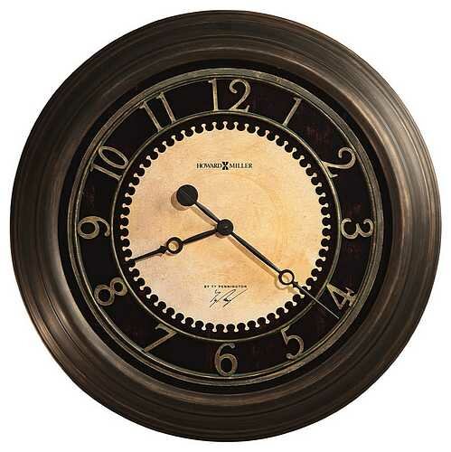 The Chadwick Gallery Wall Clock by Howard Miller is 25-1/2" in diameter and finished in antique brushed brass. The aged black dial features an aged parchment center, applied Arabic numerals finished in aged brass, aged black hour and minute hands and flat glass.