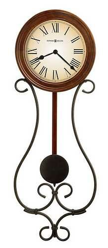 The Kersen Wall Clock by Howard Miller has a warm antique gray finish and a profiled wood bezel finished in Americana Cherry. The pendulum features a warm antique-gray bob suspended from a cherry-finished wood stick.