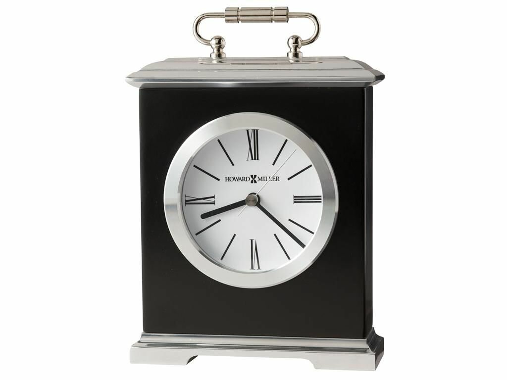 The Revere Table Clock by Howard Miller is a black satin carriage clock with a polished silver finished metal base, top and decorative handle. The white dial features black hour and minute hands and a silver seconds hand beneath a glass crystal, and is surrounded by a diamond cut, spun silver-tone metal bezel.