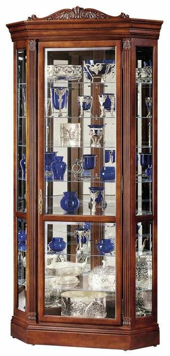 The Embassy II Corner Display Cabinet by Howard Miller is finished in lightly distressed Embassy Cherry on select hardwoods and veneers and features a beautifully detailed leaf and shell, crown pediment with fluted columns, and coordinating carved column caps. Eight levels of display offer more space for your collectibles. Beveled glass on the front panel. Four extra-deep adjustable glass shelves with continuous holes for shelf adjustment. Pad-Lock metal shelf clips lock shelves into place.