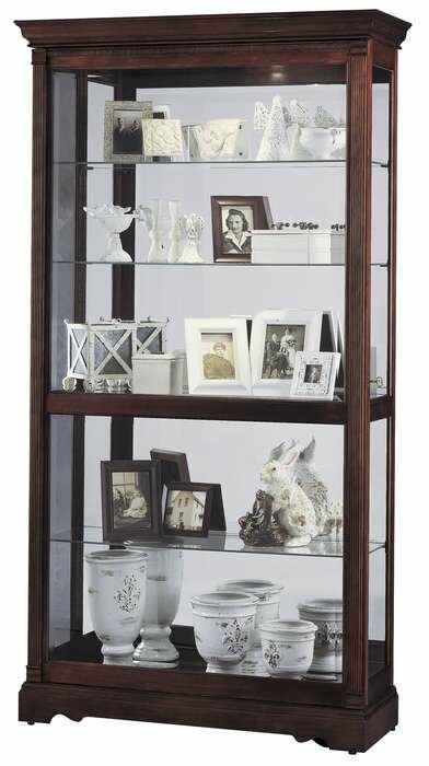 The Dublin Display Cabinet by Howard Miller is finished in Windsor Cherry on select hardwoods and veneers and features acanthus leaf molding, reeded columns with top and bottom caps, and a gently scalloped base. Front door slides in both directions for easy access. Four adjustable glass shelves with continuous holes for maximum shelf adjustment. Pad-Lock metal shelf clips lock shelves into place.