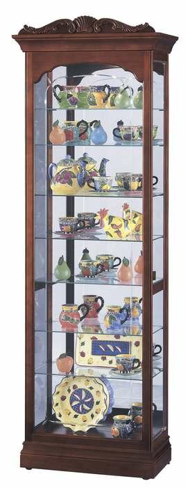 The Hastings Display Cabinet by Howard Miller is finished in Windsor Cherry on select hardwoods and veneers and features decorative shell and leaf overlays on a removable top crown, plus eight levels of display. Full-length crystal-cut grooved glass on the front. Seven adjustable glass shelves with continuous holes for maximum shelf adjustment.