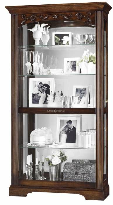 The Hartland Display Cabinet by Howard Miller is finished in a lightly distressed Hampton Cherry on select hardwoods and veneers, with a dark antique brass finished knob and plate. The cabinet also features reeded columns, decorative overlay on an arched pediment, and a decorative cutout in the base. Beveled glass on the door and glass mirrored back. Four adjustable glass shelves with continuous holes for shelf adjustment. Pad-Lock metal shelf clips lock shelves into place.