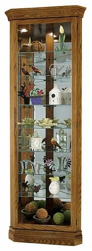 The Dominic Corner Curio by Howard Miller is finished in Legacy Oak on select hardwoods and veneers and features a beveled glass door. Adjustable glass shelves with continuous holes for maximum shelf adjustment. (Wall Dimension: 20").
