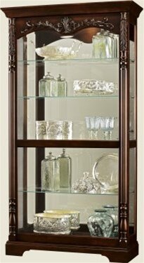 The Felicia Display Cabinet by Howard Miller is finished in Rustic Cherry with distressing on select hardwoods and veneers. The sliding front door features a decorative shell and vine overlay and large reeded columns with significantly carved Acanthus top caps and turned bottom caps. beveled glass on door and glass mirrored back. Four adjustable glass shelves with continuous holes for shelf adjustment. Pad-Lock metal shelf clips lock shelves into place.