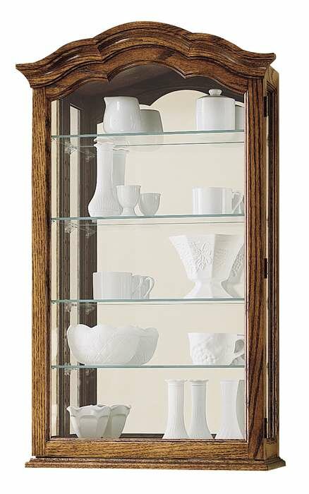 The Vancouver II Wall Curio Cabinet by Howard Miller is finished in Oak Yorkshire on select hardwoods and veneers and features a delicately arched pediment.