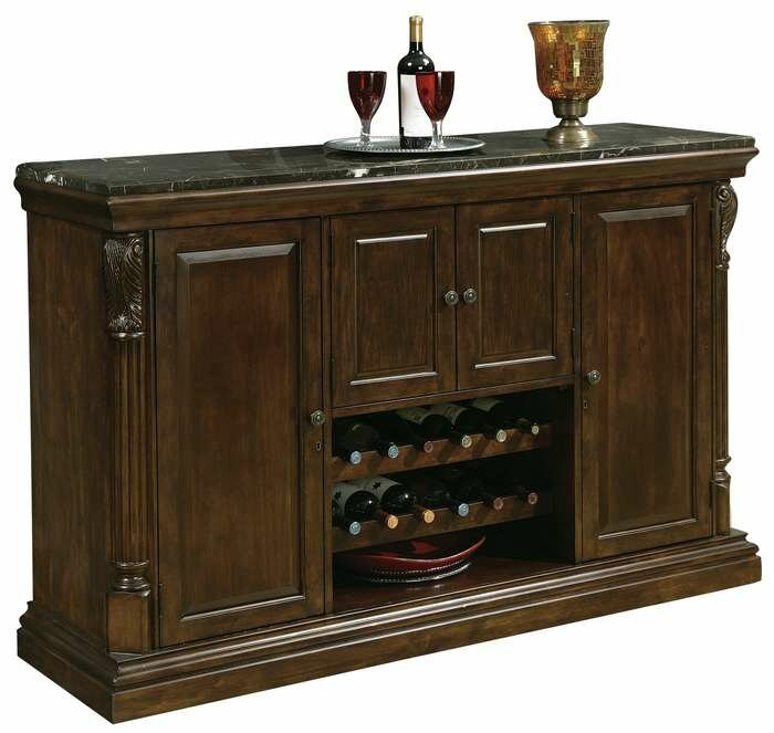The Niagara Console by Howard Miller has a distressed Rustic Cherry finish on select hardwoods and veneers. The rare, Italian marble laminated top is removable for easy handling. Features a fixed bottle opener, removable catch basket, and towel bar attached to the inside of the cabinet's center door.