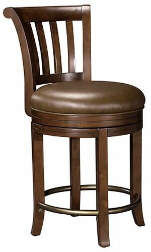 The Ithaca Pub Stool by Howard Miller features a synthetic brown leather seta cushion and antique brass-finished metal footrest. Furniture glides on all legs and a zero return swivel is provided.