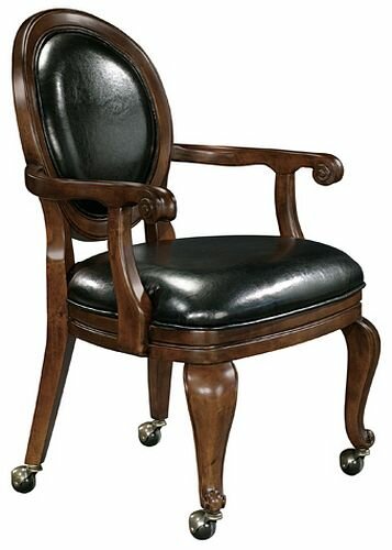 The Niagara Club Chair by Howard Miller features a synthetic black leather seat cushion and back rest, and ball casters on four legs.