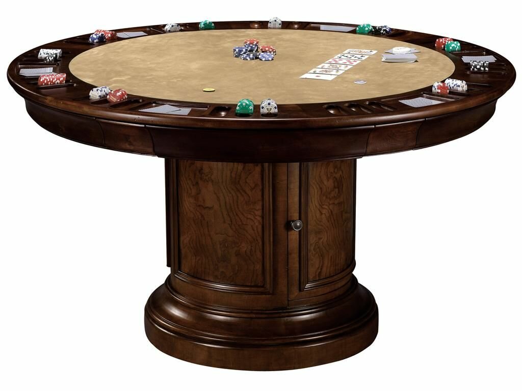 The Ithaca Game Table by Howard Miller is finished in Hampton Cherry on select hardwoods and veneers with light distressing and a durable clear coat for wear protection. Reversible top features rare olive ash burl veneers on the dining surface side and a fabric poker-playing surface on the other. Remove the top to reveal a Texas Hold 'Em surface. Storage base features four framed panels with rare olive ash burl veneers. Hinged door in base offers access to convenient storage that includes a fixed shelf.