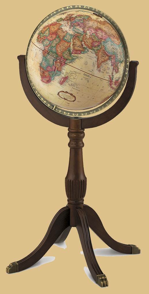 Replogle Sherbrooke 16" Antique Globe - 22716.  Decorative cartouches. Ornate compass roses. An elegant cherry-finish solid wood stand with brass claw feet. From stand to 16" globe ball, the Sherbrooke II, with rich antique ocean and raised relief, is as ornate as it is elegant.