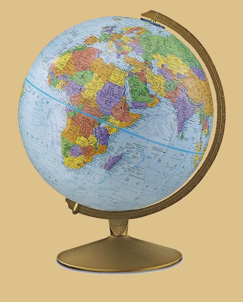 Replogle Explorer 12" Blue English Globe - 30501.  Among our most popular models. Striking colors invite students of any age to explore. The 12" blue-ocean globe offers a vibrant contrast to a metal gold-colored base. The Explorer contains more than 4,000 place names and distinctive political boundary markings. This globe is also available with French text (Model #30551) or Spanish text (Model #30561).