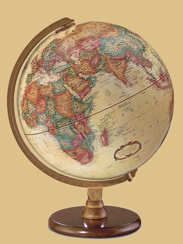Replogle Hastings 12" Antique English Globe - 31509.  The Hastings will give you a world perspective. Its enduring appeal comes from the antique-ocean 12" globe ball, solid walnut-finish hardwood base, and die-cast semi-meridian. Even in your office, the world is within reach. This globe is also available with French text (Model #31552).