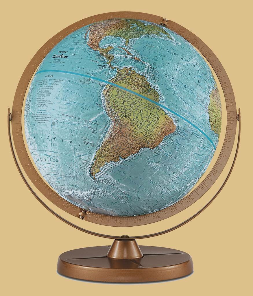 Replogle Atlantis 12" Blue Globe - 33801.  Land areas on this special globe are in true-to-life color to illustrate mountains, deserts, forests and grasslands. Oceans show undersea physical features. Gyro-matic mounting with numbered full-meridian swings up or down to bring any area into closer view.