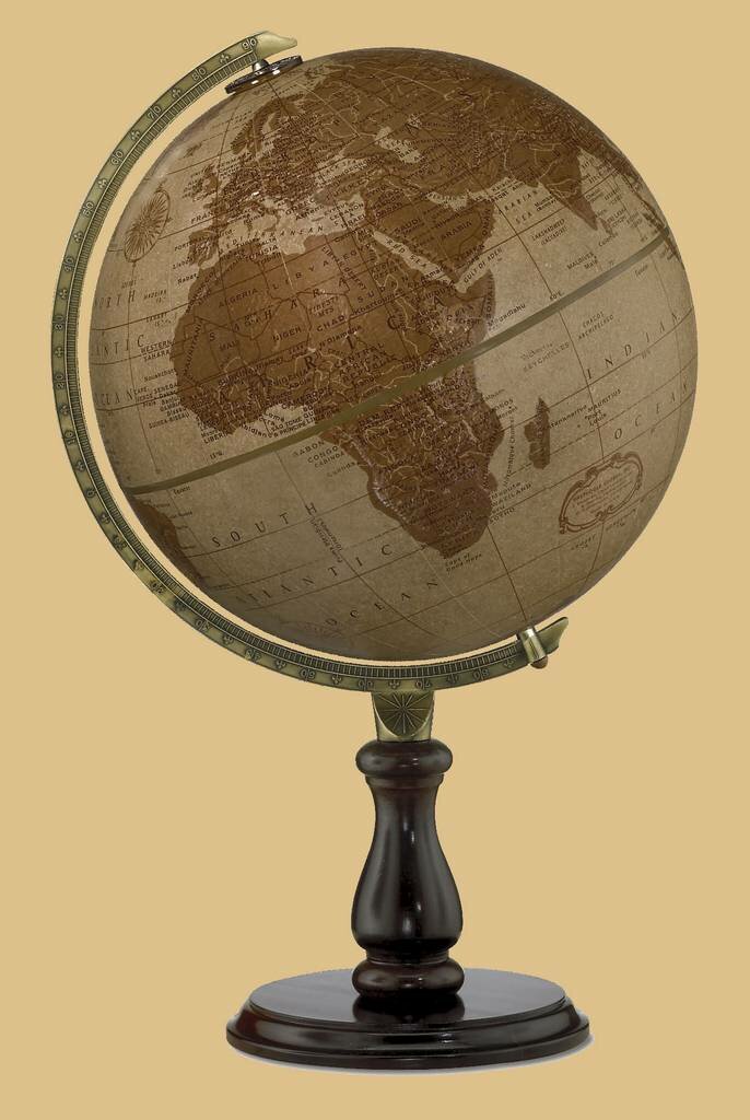 Replogle Leather Expedition 12" Globe - 35522.  This exclusive desktop accessory offers a genuine leather 12" globe with die-cast semi-meridian mounted on a hardwood base. A unique take on the globe and a perfect gift.