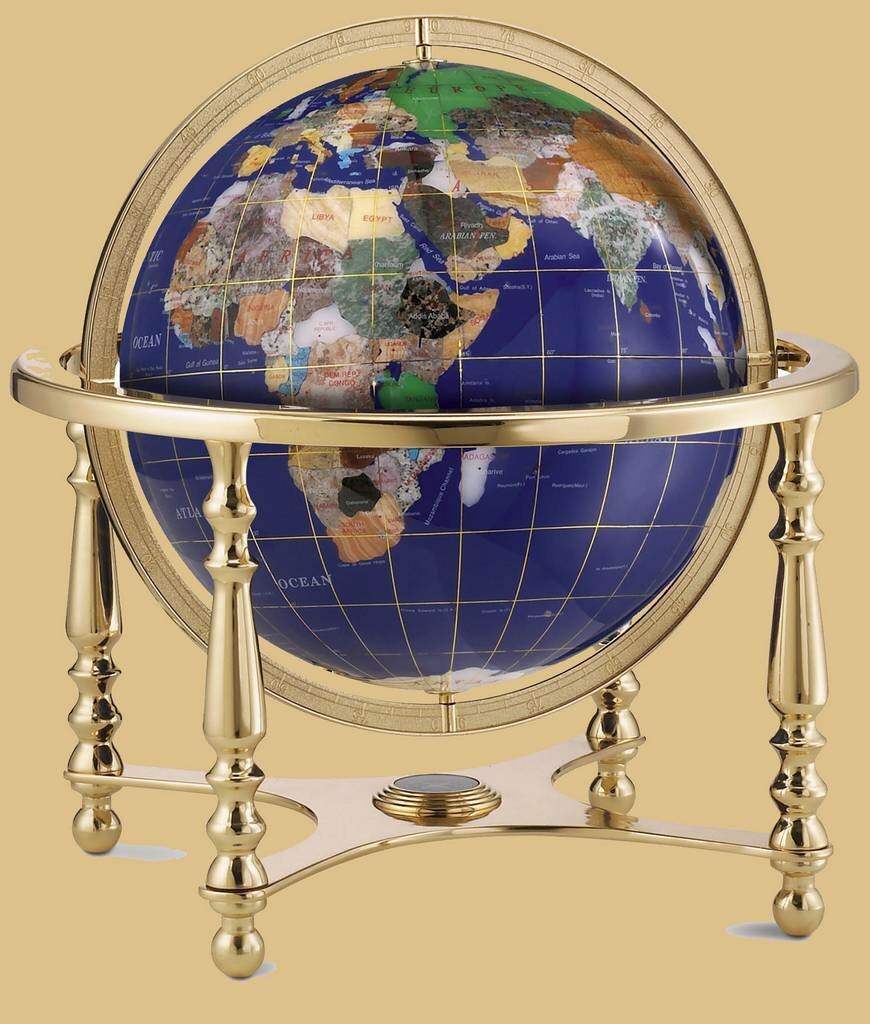 Replogle Compass Jewel 13" Gemstone Globe - 38700.  This exquisite desktop accessory is a 13" diameter blue lapis-ocean globe beautifully inlaid with over 25 different semi-precious gemstones that have been hand carved into the shape of countries and continents. A gold-colored stand and meridian with built-in compass cradles the globe.