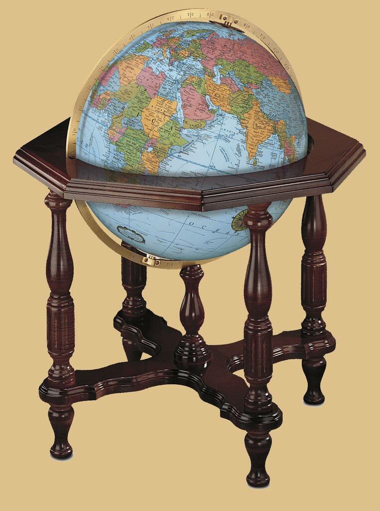 Replogle Statesman 20" Blue Illum Globe - 65125.  The blue-ocean Statesman features a hand-applied, hand-cut map.  This 20" diameter illuminated globe is mounted on a striking hardwood base. Classic design details, solid brass engraved meridian, and light control make this a bold addition to any environment.
