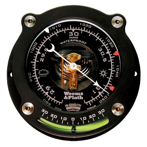 Hydrophobic filter allows air to pass yet resists water. The filter will easily stop the entrance of water due to continuous spray and because of its unique construction, it is waterproof to a depth of 3 feet for 30 minutes. It includes a patented "high sensitiv" all metal aneroid movement and has an expanded scale so that the needle noticeably moves as weather conditions change. The scale ranges from 28.5" to 31.5" instead of the traditional 27.5" to 31.5" Hg. It also can be read in millibars.